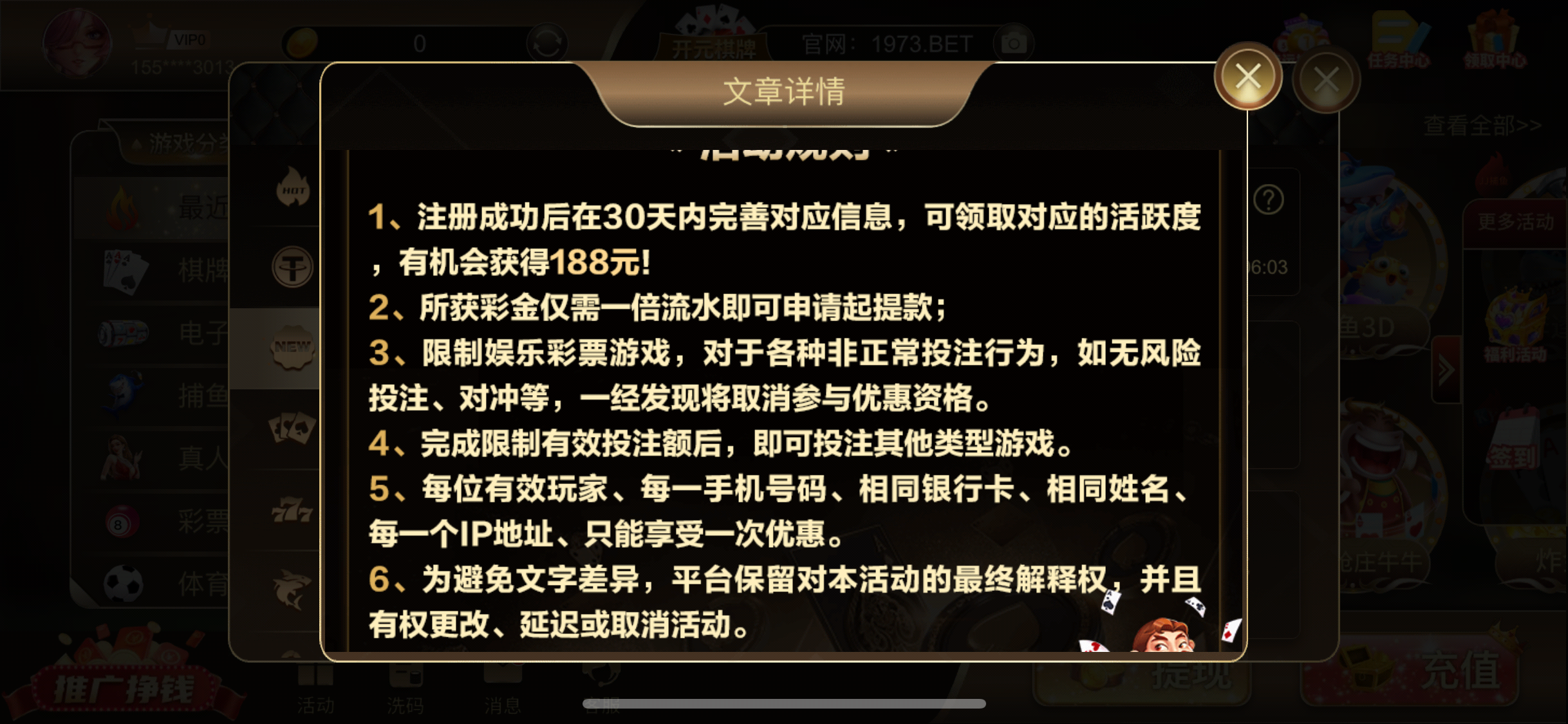 新用户手机号注册绑卡 任务里领取188彩金 系统说是随机抽取 我领到5积分 放着等晚点再看看 说不定送了 无游戏限制 最低提款100元