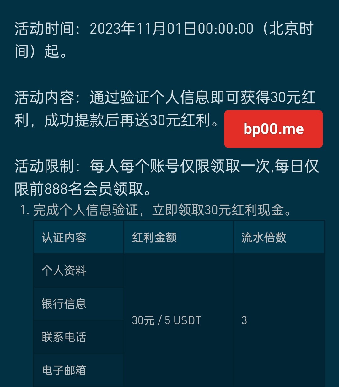 新用户注册绑定银行卡手机号邮箱安全问题自动秒送30元彩金 首次提现成功以后自动再送30元彩金 无游戏限制3倍流水 最低提款100元 之前发过的不过活动改了
