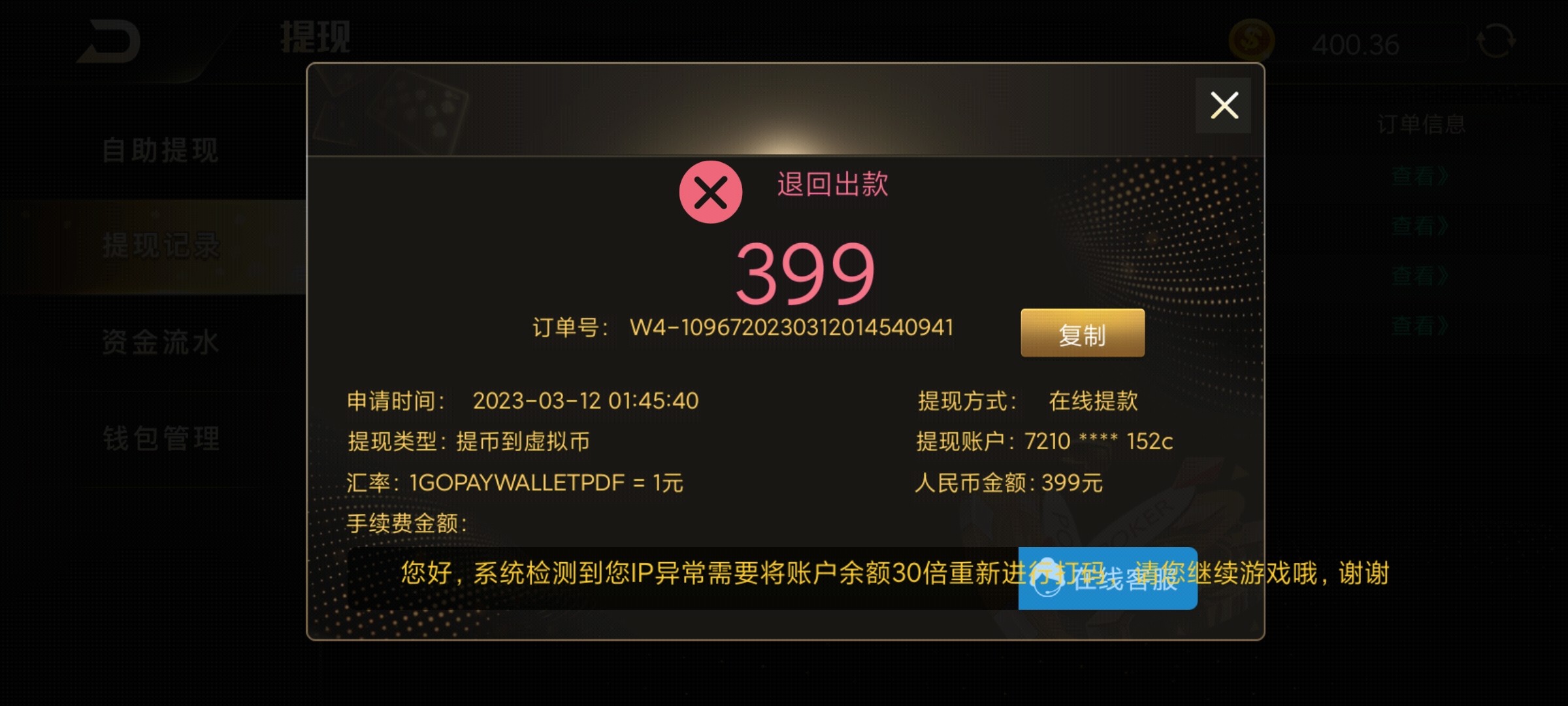 充值130,裸玩玩ag然后提现247退回➕30倍流水,打完流水提399又➕30倍流水,后面要我冲300说解除风控,我冲了,然后打到900多提现封号,8195真是死了妈。