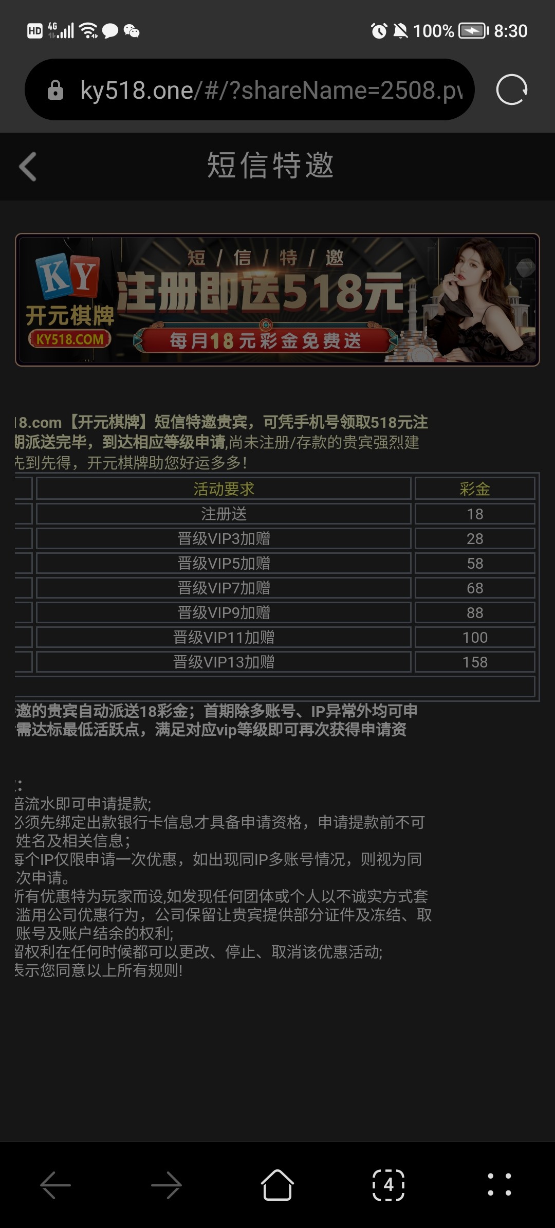 您好,特邀彩金需您注册会员账号,绑定收到短信的手机号,注册成功后登录账号系统自动派送8—518元彩金哦 ,谢谢