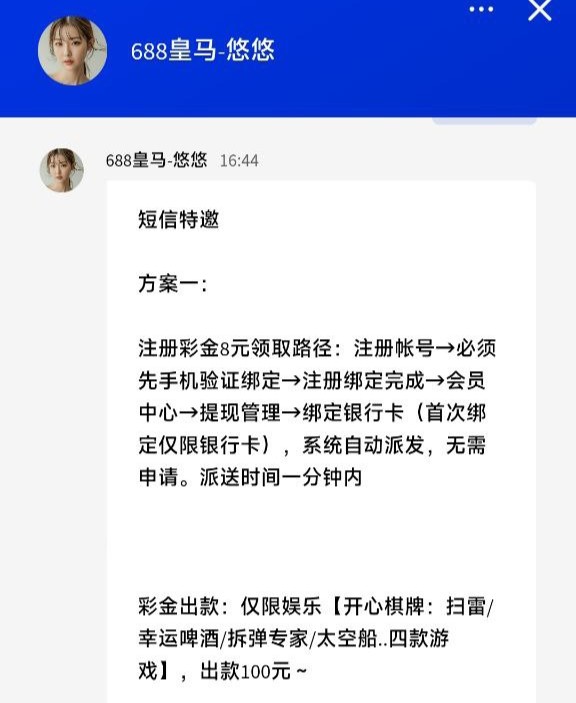 注册彩金8元领取路径:注册帐号→必须先手机验证绑定→注册绑定完成→会员中心→提现管理→绑定银行卡(首次绑定仅限银行卡),系统自动派发
