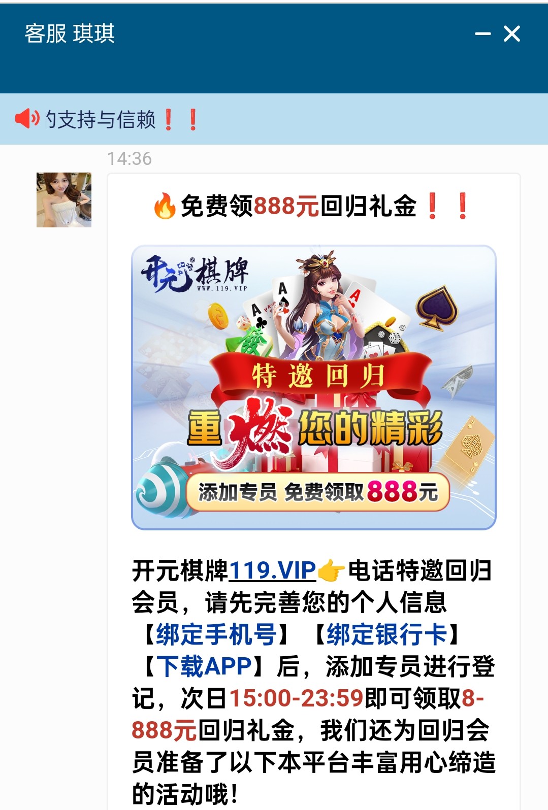 之前是特邀的登入上去联系客服获取旺旺专员的旺旺号,送8/888彩金,具体自行查看