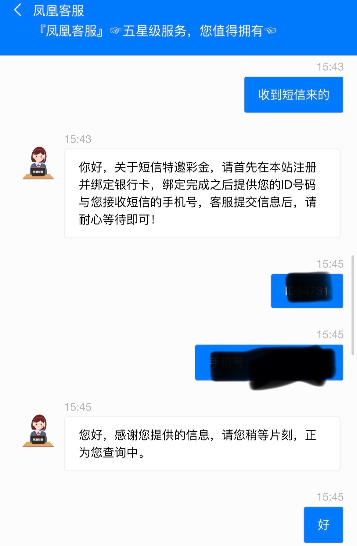 碰瓷短信特邀,注册绑定银行卡手机号复制ID联系客服申请,查手机号,3倍流水,要充值10块才能娱乐其它游戏不然只能玩彩票最低100提现,没碰瓷到可以下载APP申请注册彩金
