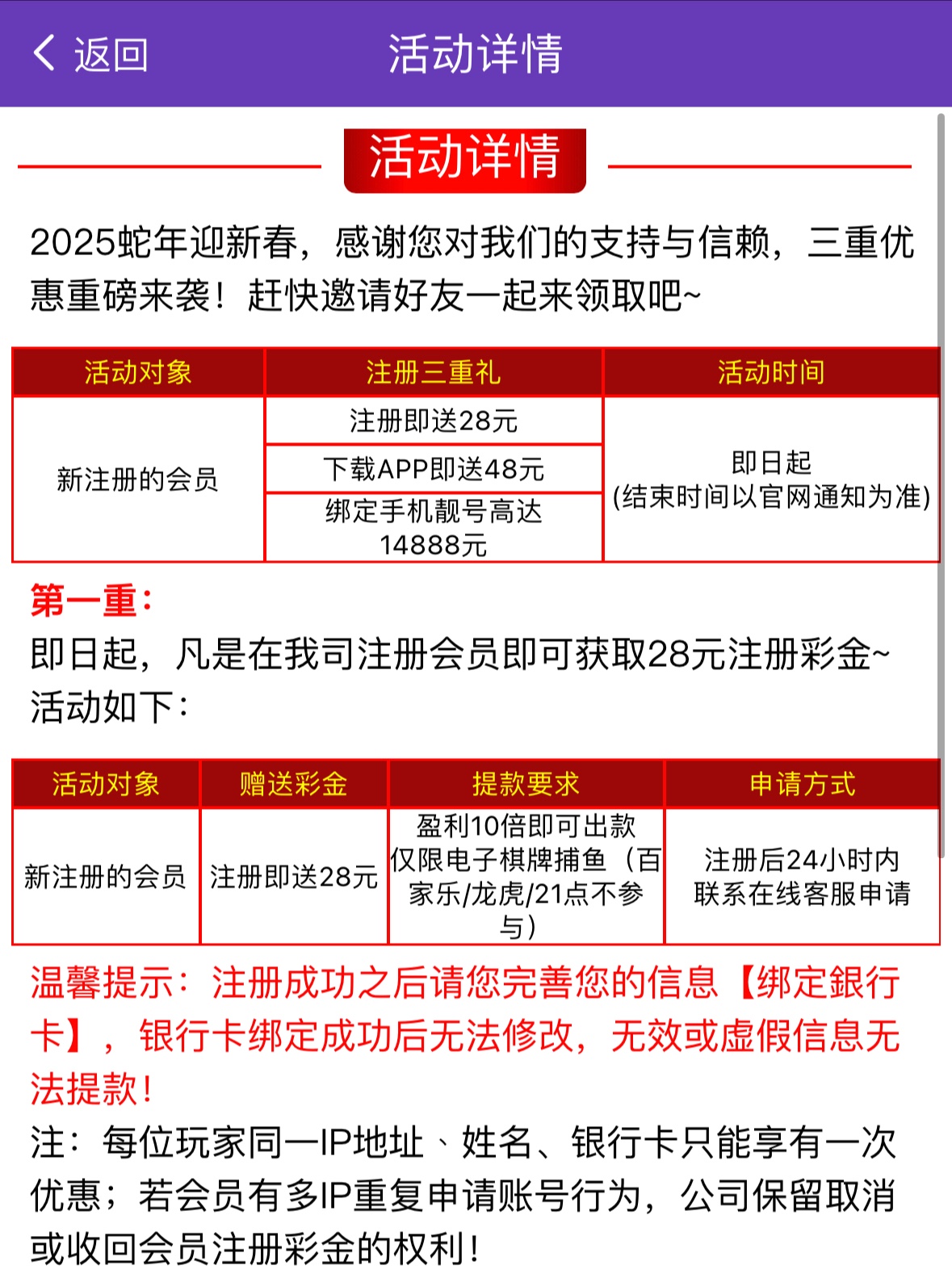 注册完善资料联系在线客服申请注册28彩金,下载APP发送站内信联系客服送48彩金,盈利彩金的10倍才能出款,限电子捕鱼棋牌