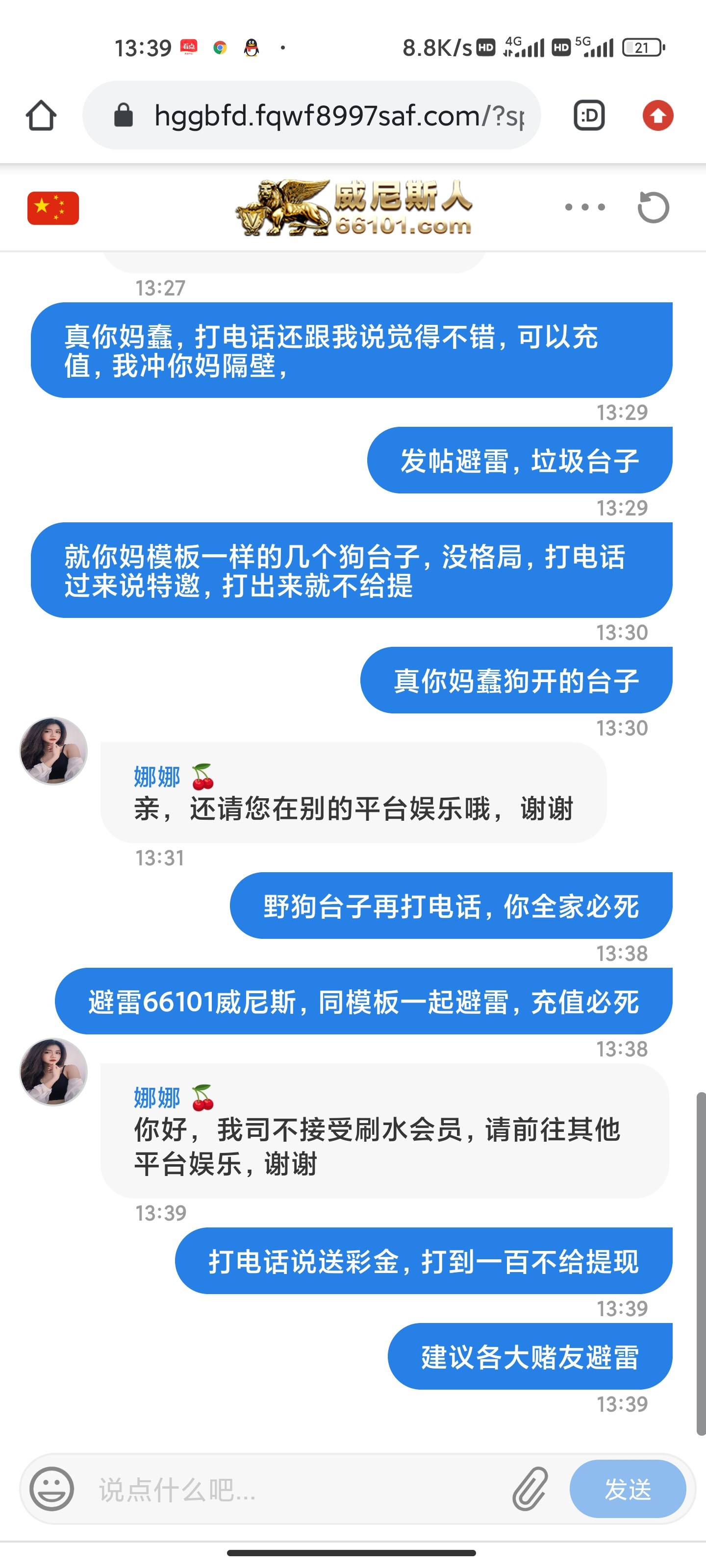 避雷66101威尼斯,同模板一起避雷,打电话跟我说签到领彩金,不需要流水就可以提现,我玩pg电子打了200流水好不容易打到一百,提现直接冻结账号,希望各位老哥遇到了不要充值,充值死