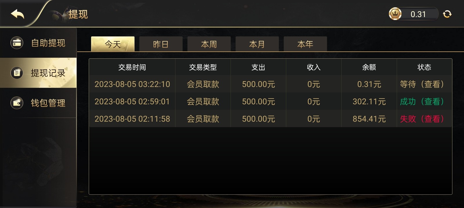 送了十九昨晚打到三百多不给下,最低提款五百,后面到了八百多下款五百说流水不够,又打了二百多流水下了五百,到账了,剩下三百多打到五千多直接让我充值