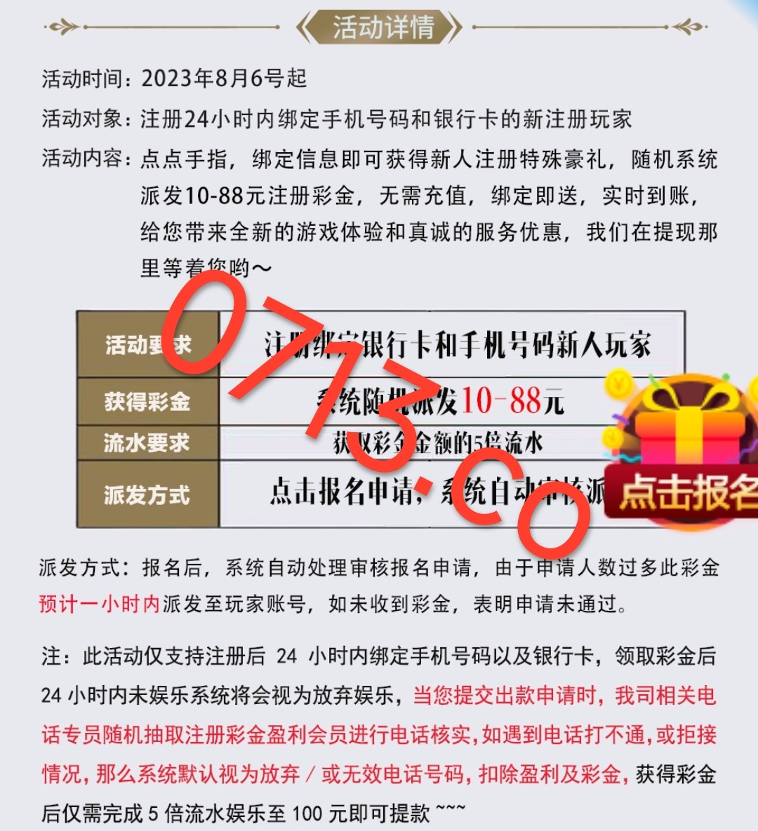 新用户注册绑卡自助领取10~88彩金 五倍