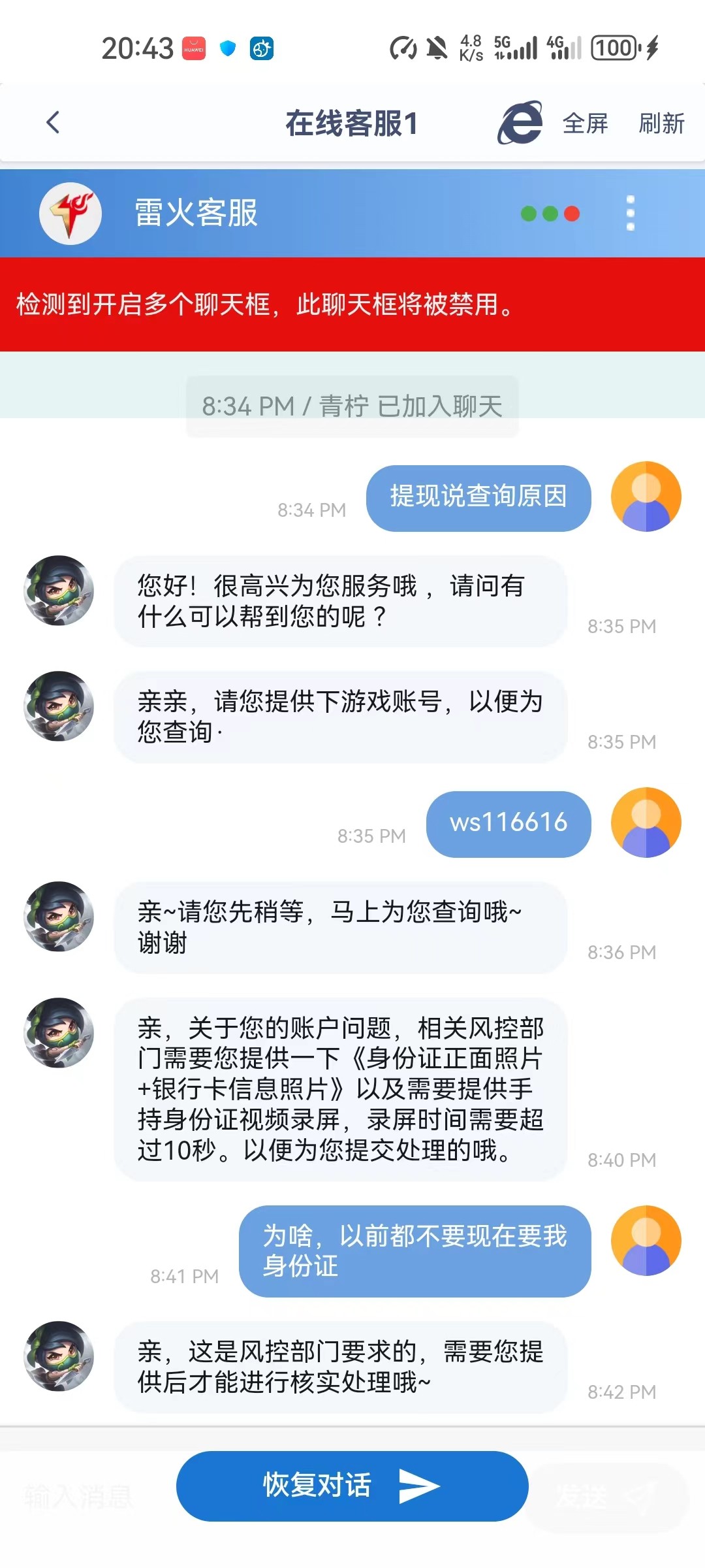 之前也玩过冲了也有几个,前几天打我电话说特邀回归,送了58没发出来,然后自己充值玩了几天,前几天都输完了没提款,今天提款200多块钱不给出要手持身份证,搜了一下历史帖说给完手持就封号没敢给,雷火现在都黑老用户了吗