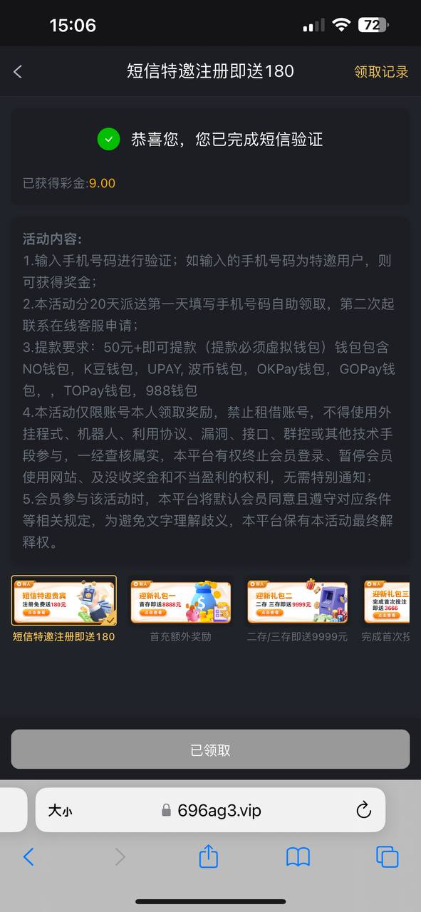 优惠完成短信验证领取9元,第二天找客服在申请9元,彩金无限制满足50电子钱包出款。