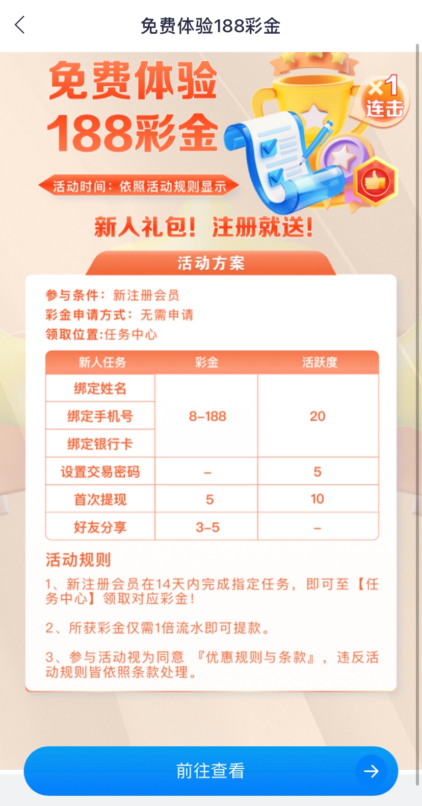 注册绑定实名/手机号/银行卡任务中心领取,彩金一倍流水